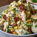 The aroma wafts through the air, making your kitchen feel like a warm embrace. The scent of crispy bacon sizzles, accompanied by just a hint of garlic and paprika that lingers tantalizingly. This isn’t just chicken salad; it’s an unforgettable experience, a dish so rich and satisfying that it excites both the mind and taste buds. Served chilled, this salad offers a refreshing bite, perfect for hot summer days or cozy winter gatherings. Each spoonful not only nourishes your body with high protein goodness but also satisfies your cravings for something bold and flavorful.