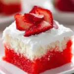 A moist, fluffy cake filled with vibrant strawberry jello and topped with whipped cream and fresh strawberries, perfect for summer celebrations.